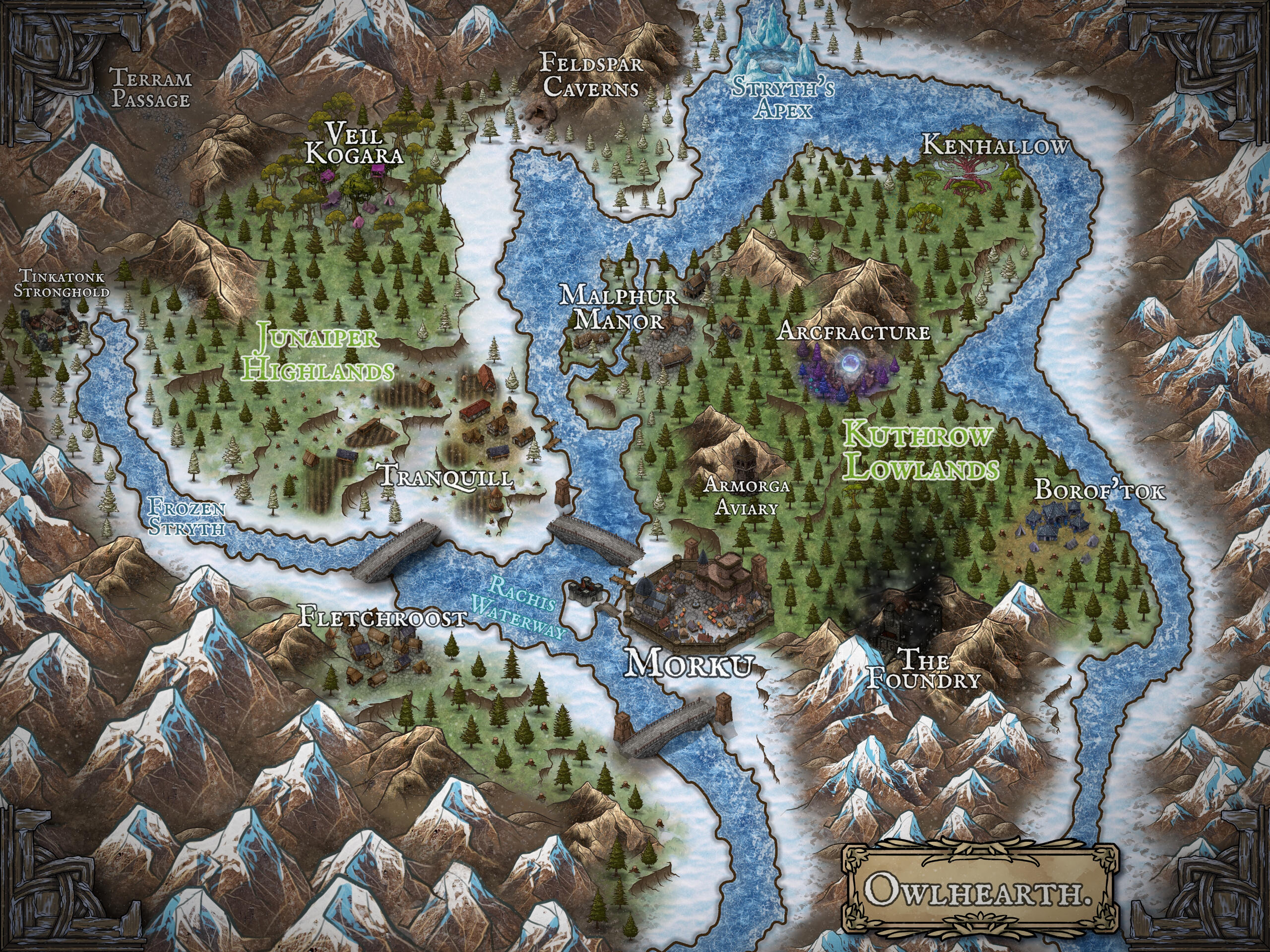 The majority of Owlhearth's lower section is split into two discernable halves - the Highlands and the Lowlands.